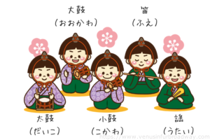 ※お囃子(はやし)で使う和楽器の擬音が並びます。囃子は、四拍子を笛、大鼓、小鼓、太鼓でもって、謡や能をはやしたてる日本独自の音楽です。現代では、ひな祭りの五人囃子をみるとわかりやすいですね。『たぁぷぽぽ』・『たっぽたっぽ』は、太鼓の音の擬音。『ちりから』は、音から一人で大鼓と小鼓の2つを担当する二挺鼓(にちょうつづみ)の異名となっています。「つったっぽ」は太鼓の音と釣ったタコとかけている。さらに、「笛」の擬音の「ヒィ」から「干(ひぃ)だこ」にかけている言葉遊びです。